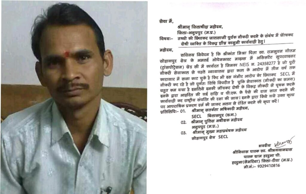 साउथ ईस्टर्न कोलफील्ड्स लिमिटेड (SECL) के सोहागपुर क्षेत्र अंतर्गत अमलई ओपनकास्ट माइन्स में असिस्टेंट सुपरवाइजर (ट्रांसपोर्टेशन) के पद पर कार्यरत श्रीकांत मिश्रा पर गंभीर आरोप लगे हैं प्राप्त जानकारी के अनुसार, श्रीकांत मिश्रा (NEIS न. 24358277) ने नियुक्ति के समय अपनी आपराधिक पृष्ठभूमि को छिपाकर नौकरी हासिल की थी, जबकि वे पूर्व में हत्या के आरोप में न्यायालय द्वारा दोषसिद्ध होकर तीन वर्ष तक कारावास की सजा भुगत चुके हैं