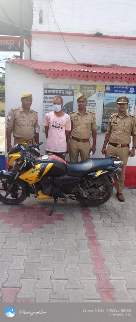 व क्षेत्राधिकारी महोदय नगर के पर्यवेक्षण में एंव मुझ प्र0नि0 के नेतृत्व में थाना गंज पुलिस द्वारा आज दिनांक 16.07.2025 को थाना हाजा पर पंजीकृत मु0अ0सं0 143/2025 धारा 317(2)/317(4) बीएनएस में गिरफ्तारशुदा एक नफर अभियुक्त यासीन उर्फ यामीन पुत्र इकबाल निवासी मौहल्ला राजद्वारा खुर्मे वाली ज्यारत थाना कोतवाली जनपद रामपुर उम्र करीब 35 वर्ष को सैजनी नानकार थाना गंज से समय करीब 13.40 बजे गिरफ्तार किया गया । जिसके पास से एक पीले रंग की अपाचे नम्बर KA53EA6105 व चेसिस नम्बर MD634KE42D2A48744 व इंजन नम्बर OE4AD2436393 बरामद हुयी । अभियुक्त को माननीय न्यायालय जनपद रामपुर महोदय के समक्ष पेश किया जा रहा है ।