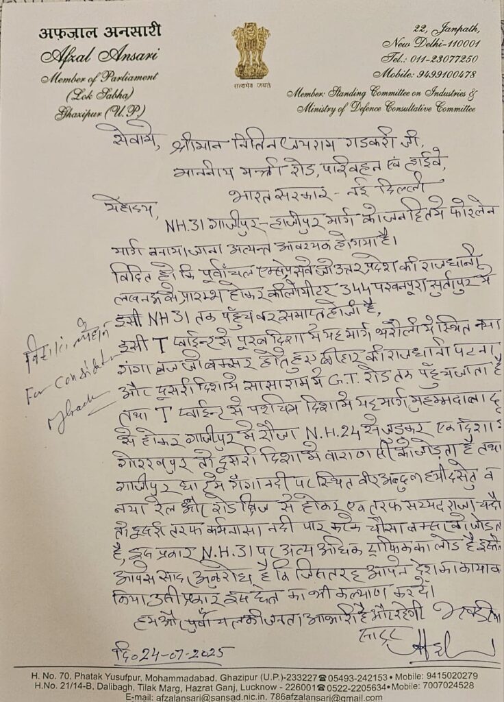 गाजीपुर के सपा सांसद अफजाल अंसारी ने केंद्रीय मंत्री नितिन गडकरी से मुलाकात की और NH 31 गाजीपुर हाजीपुर मार्ग को फोर लेन किए जाने की मांग की। उन्होंने 24 जुलाई को मानसून सत्र के दौरान दिल्ली में नितिन गडकरी से मिलकर एक हाथ से लिखित पत्र दिया, जिसकी फोटो सोशल मीडिया पर वायरल हो रही है।