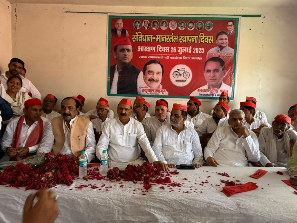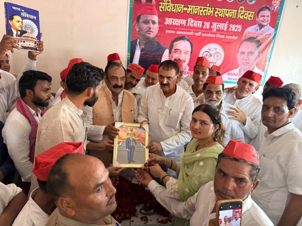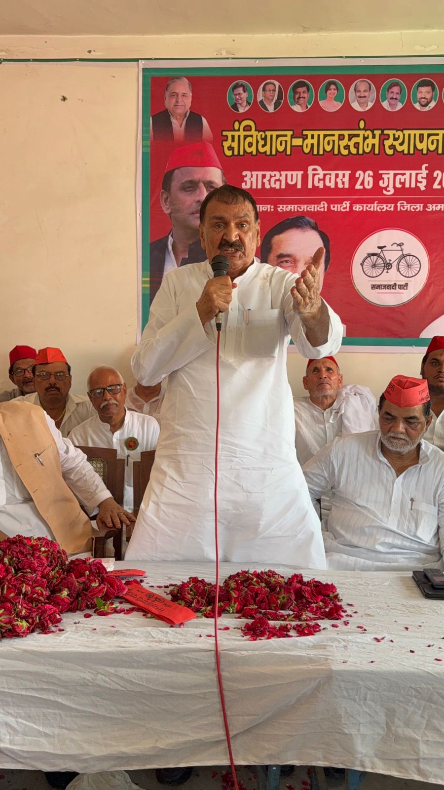 आज समाजवादी पार्टी के राष्ट्रीय अध्यक्ष एवं पूर्व मुख्यमंत्री माननीय श्री अखिलेश यादव के आवाहन पर संविधान निर्माता बाबा साहब डॉ. भीमराव अम्बेडकर की विचारधारा और आरक्षण के संवैधानिक अधिकारों की रक्षा के संकल्प के साथ समस्त पीडीए (पिछड़ा, दलित, अल्पसंख्यक) समाज द्वारा ‘आरक्षण दिवस’ एवं ‘संविधान-मानस्तंभ स्थापना दिवस’ के पावन अवसर पर एक भव्य महासभा का आयोजन समाजवादी पार्टी अमरोहा के कार्यालय में किया गया।