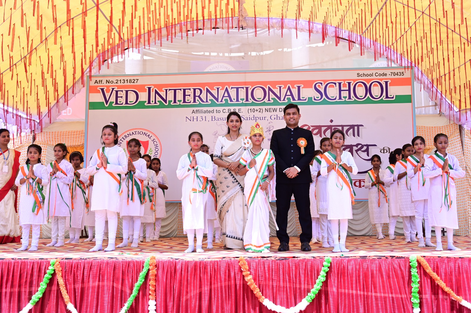 सैदपुर क्षेत्र के बासूपुर स्थित वेद इंटरनेशनल स्कूल में 79 वां स्वतंत्रता दिवस धूमधाम एवं देशभक्ति की भावना के साथ मनाया गया। कार्यक्रम का शुभारंभ विद्यालय के वाइस चेयरमैन दिनेश श्रीवास्तव एवं प्रबंध निदेशक पंकज प्रकाश श्रीवास्तव के द्वारा ध्वजारोहण कर राष्ट्रगान के सामूहिक गायन से हुआ। तिरंगे के सम्मान में उपस्थित सभी विद्यार्थियों, अभिभावकों एवं क्षेत्रीय नागरिकों ने देशभक्ति के नारों से वातावरण को गुंजायमान कर दिया। विद्यालय के वरिष्ठ छात्रों ने मार्च पास्ट और कनिष्ठ छात्रों ने म्यूजिकल पीटी का शानदार प्रदर्शन किया ।