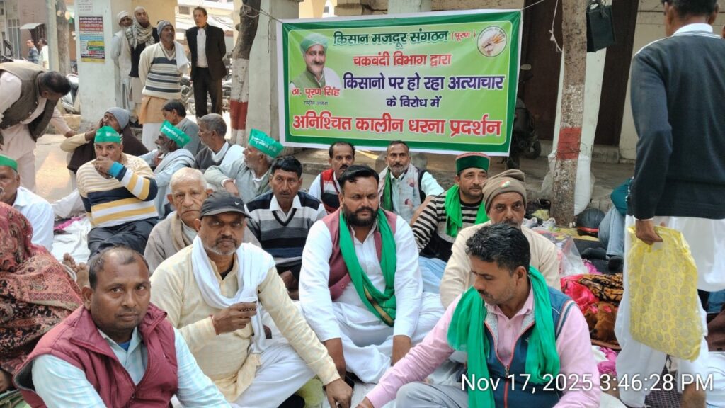 मुजफ्फरनगर। चरथावल क्षेत्र के ग्राम दूधली के किसानों ने चकबन्दी विभाग पर गलत नक्शा-23 जारी करने, किसानों की आपत्तियाँ न सुनने और लगातार टालमटोल करने का आरोप लगाते हुए सोमवार को कलेक्ट्रेट परिसर में जोरदार धरना शुरू कर दिया। किसान मजदूर संगठन (पंजी. 1302/18) के युवा जिला अध्यक्ष बिल्लू राणा के नेतृत्व में बड़ी संख्या में किसान कलेक्ट्रेट पहुंचे और विभाग के खिलाफ नाराजगी जताई।