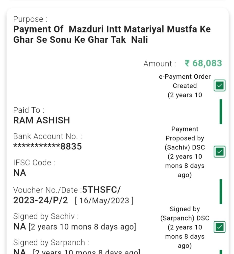 स्थानीय सूत्र बताते हैं कि।ग्राम प्रधान और सचिव की मिलीभगत से यह भुगतान किया गया है, जिससे सरकारी नियमों की खुलेआम अनदेखी हुई है। ग्रामीणों का कहना है कि मजदूरों के हक का पैसा सीधे उनके खातों में जाने के बजाय प्रधान के खाते में भेजा गया, जो गंभीर वित्तीय अनियमितता की ओर इशारा करता है।
