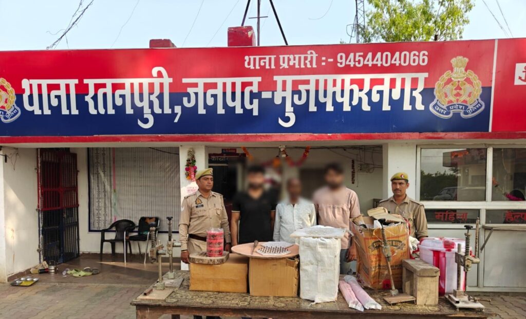मुजफ्फरनगर। रतनपुरी क्षेत्र के गांव मोहम्मदपुर माफी में अवैध रूप से संचालित पटाखा फैक्ट्री में आग लगने की घटना के बाद पुलिस ने बड़ी कार्रवाई करते हुए तीन वांछित आरोपियों को गिरफ्तार कर लिया। पुलिस ने मौके के पास बने गोदाम समेत तीन स्थानों पर छापेमारी कर भारी मात्रा में तैयार-अधबने पटाखे, बारूद, पोटाश और पटाखा निर्माण में इस्तेमाल होने वाले उपकरण बरामद किए हैं।