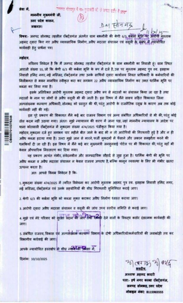 इस प्रकरण को लेकर भारतीय जनता पार्टी अल्पसंख्यक मोर्चा, काशी क्षेत्र के सदस्य अल्ताफ अहमद क़ादरी ने पूर्व में जिला अल्पसंख्यक कल्याण अधिकारी सोनभद्र को विस्तृत शिकायत पत्र सौंपा था। शिकायत में अधिकारियों की उदासीनता पर सवाल उठाते हुए कहा गया था कि राजनीतिक दबाव के चलते जांच को अब तक जानबूझकर ठंडे बस्ते में डाल दिया गया।