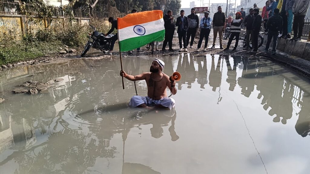 मुज़फ्फरनगर। परिक्रमा मार्ग पर हो रहे जल भराव से त्रस्त होकर आज आजाद भारत के गुलाम विजय हिंदुस्तानी ने बेड़िया और कैदियों की ड्रेस पहनकर सड़क के जल भराव में जल समाधि ले ली। विजय हिंदुस्तानी का आरोप है कि पिछले कई सालों से यह सड़क बद हाल और इस मार्ग की एक साइड पर जल भराव होने की वजह से बिल्कुल बंद हों गई है। और दूसरी साइड में भी जगह-जगह गड्ढे और जल भराव हो रहा है। विजय हिंदुस्तानी ने इसकी घोषणा बीते कल सोशल मीडिया पर एक वीडियो डालकर कर दी थी जिसमें उन्होंने प्रशासन को चेतावनी देते हुए कहा था जब तक परिक्रमा मार्ग का निर्माण कार्य शुरू नहीं होगा तब तक जल्द समाधि में रहूंगा इस के तहत आज सुबह होते ही विजय हिंदुस्तानी बेड़िया पहनकर और कैदियों वाली ड्रेस में परिक्रमा मार्ग पर हो रहे जल भराव में बैठकर जल समाधि ले ली। प्रशासन को चेतन देते हुए कहा यदि जल्दी यहां पर कोई कलाधिकारी नहीं आया तो एक फीट गड्ढा खोदकर उसमें बैठ जाऊंगा।