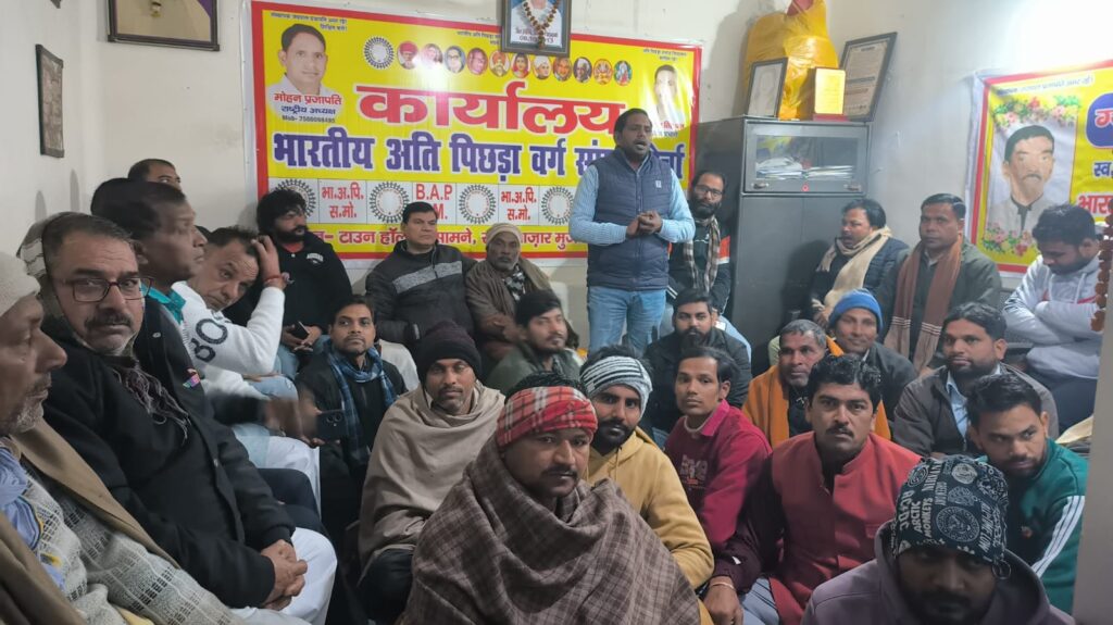 मुज़फ्फरनगर। भारतीय अति पिछड़ा वर्ग संघर्ष मोर्चा के राष्ट्रीय अध्यक्ष मोहन प्रजापति को अज्ञात व्यक्ति द्वारा जान से मारने की धमकी दिए जाने के बाद संगठन में रोष फैल गया। मामले को लेकर टाउन हॉल स्थित कार्यालय पर आपात बैठक बुलाई गई, जिसमें दबंगों के खिलाफ संघर्ष को और तेज करने का निर्णय लिया गया।