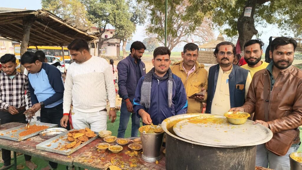 फतेहपुर । कानपुर नगर के साढ़ थाना क्षेत्र के कुड़नी गांव में स्थित प्रसिद्ध (सिद्ध) बजरंगबली मंदिर में बसंत पंचमी के पावन अवसर पर रविवार को विशाल भंडारे का आयोजन किया गया। यह भंडारा कानपुर निवाशी संजीव तिवारी और योगेंद्र सिंह के सौजन्य से संपन्न हुआ, जिसमें क्षेत्र के बड़ी संख्या में श्रद्धालुओं और दर्शनार्थियों ने सहभागिता की। बसंत पंचमी के शुभ दिन मंदिर परिसर में सुबह से ही श्रद्धालुओं का तांता लगा रहा। श्रद्धालुओं ने विधि-विधान से पूजा-अर्चना कर बजरंगबली के दर्शन किए और इसके उपरांत विशाल भंडारे में प्रसाद ग्रहण किया। भंडारे में श्रद्धालुओं को सब्जी-पूड़ी परोसी गई, जिसे सभी ने श्रद्धा और उत्साह के साथ ग्रहण किया। आयोजन के दौरान मंदिर परिसर में भक्तिमय माहौल बना रहा। जय बजरंगबली के जयकारों के बीच सेवाभाव से जुड़े लोग व्यवस्था संभालते नजर आए। कार्यक्रम में गौरव तिवारी,( पत्रकार)कुलदीप तिवारी,राजू तिवारी, सौरभ तिवारी, योगेंद्र सिंह, सहित अन्य गणमान्य लोग और स्थानीय ग्रामीण मौजूद रहे, जिन्होंने आयोजन में सहयोग प्रदान किया। आयोजकों ने बताया कि इस प्रकार के धार्मिक और सामाजिक आयोजन समाज में आपसी भाईचारे, सहयोग और सेवा की भावना को मजबूत करते हैं। भंडारे के सफल आयोजन पर क्षेत्रवासियों और श्रद्धालुओं ने आयोजक की सराहना की।